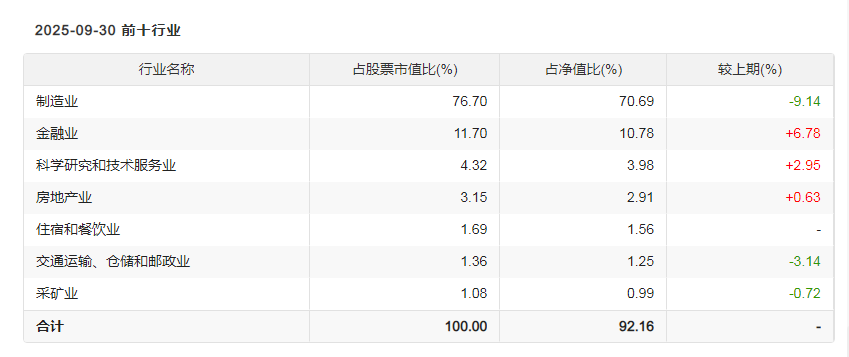 第三,基金的行业集中度较高。前十大重仓股占比49.88%,行业集中度较高,主要集中在制造业(占比超70%)。这种高集中度配置在行业轮动较快的市场环境中可能带来更大的风险。