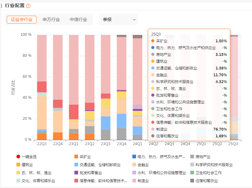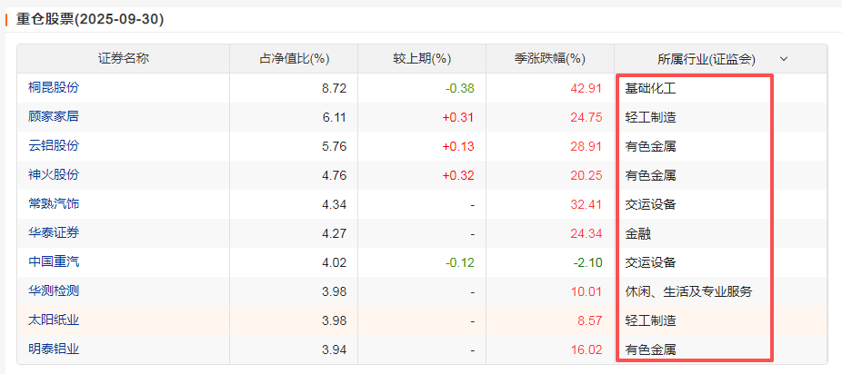 在行业配置方面,该基金长期集中于制造业(占比超70%),2025年Q3前十大重仓股集中在顺周期板块,如化工(桐昆股份)、铝业(云铝股份、神火股份)、汽车(中国重汽)、家居(顾家家居)等。行业集中度较高,但内部细分行业较为多元。