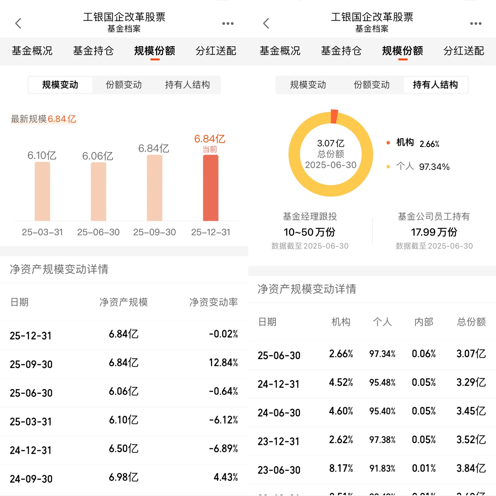 最后,我注意到这只基金的持有人结构,97.34%是个人投资者,机构占比只有2.66%,而且基金规模稳定在6.84亿左右,属于中小规模基金。这种结构有什么好处?首先,个人投资者的持有周期相对较长,不会像机构那样因为业绩考核或流动性需求频繁申赎,这能让基金经理更从容地执行投资策略,不用为了应对大额赎回而被动减仓。其次,中小规模基金的调仓灵活性更高,基金经理可以更精准地买入或卖出个股,尤其是在有色这种周期板块,行情变化快,灵活调仓非常重要。而且基金的流动性风险也很低,6.84亿的规模在极端市场环境下,不会出现大额赎回导致的净值大幅波动。另外,基金经理和公司员工也参与了跟投,基金经理跟投10-50万份,公司员工持有17.99万份,这种利益绑定机制,能让基金经理更用心地管理基金,毕竟自己的钱也在里面,不会盲目冒险。