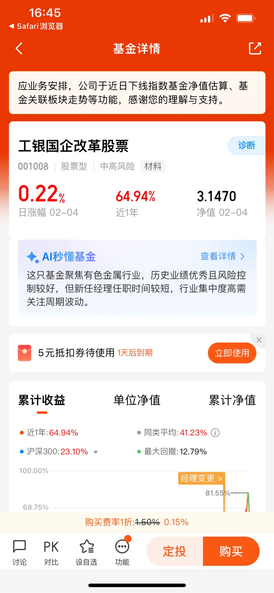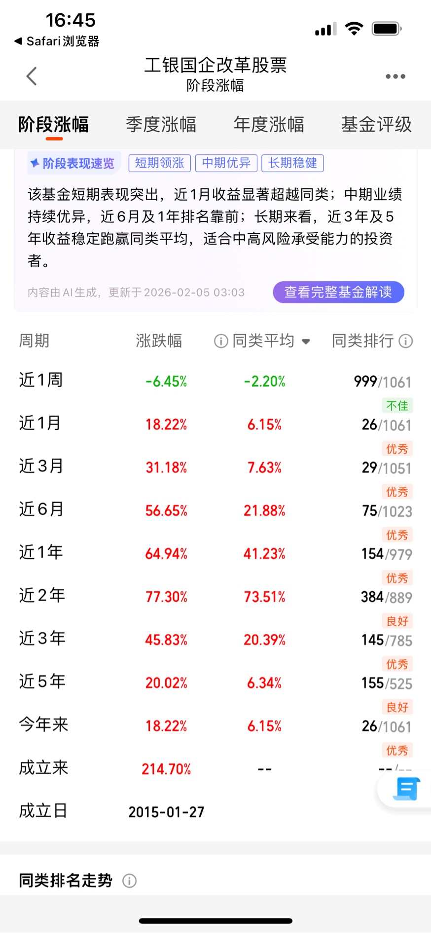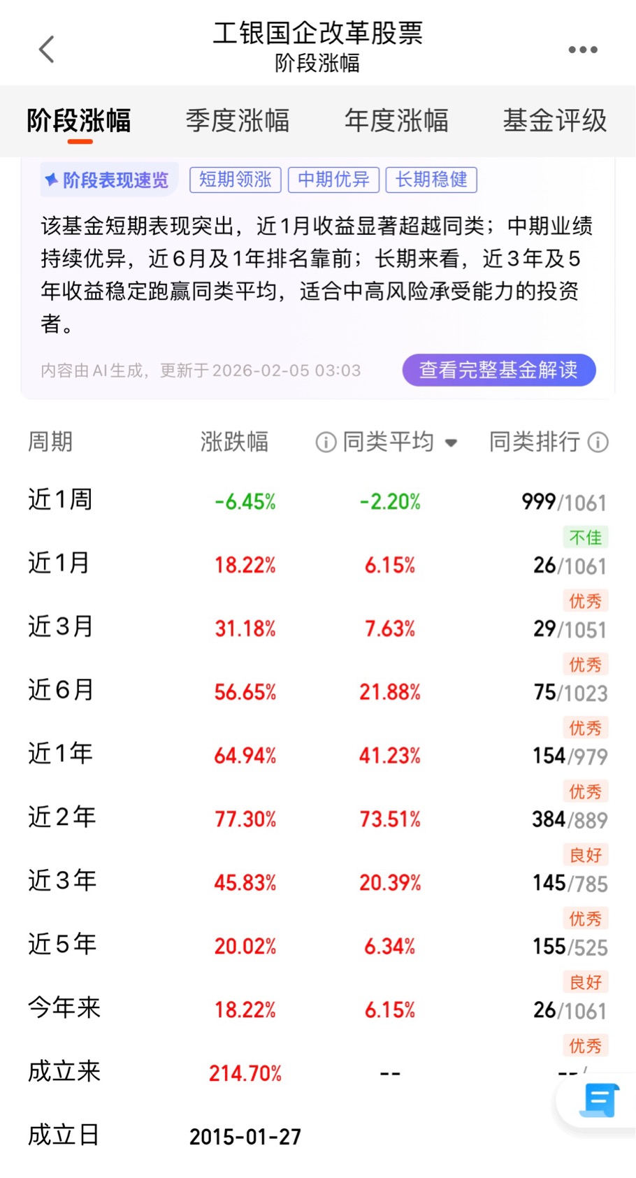 看基金不能只看短期热闹,得看长期表现。工银国企改革成立于2015年,截至2026年2月,成立以来总回报214.70%,年化回报超过10%,这个成绩在同类基金里已经非常能打。再看阶段性表现,近1年收益率64.94%,大幅跑赢同类平均的41.23%;近3年收益率45.83%,同样远超同类的20.39%;近5年收益率20.02%,在市场经历几轮牛熊切换后依然能取得正收益,说明这只基金的长期收益能力是经得起考验的。短期来看,近1月收益18.22%,近3月31.18%,近6月56.65%,排名都在同类前30%甚至前10%,尤其是在2025年四季度市场震荡的环境下,还能取得这么高的收益,充分体现了基金经理的选股能力和调仓水平。