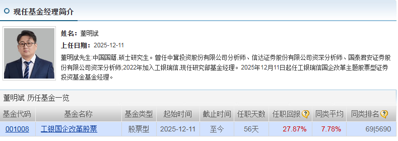 基金管理人工银瑞信基金,依托工商银行背景,拥有强大的投研资源与综合金融服务能力,能够深度挖掘国企改革领域的优质标的,精准把握行业趋势与政策导向,为基金投资决策提供专业支撑;基金经理董明斌自2025年12月起任职,具备丰富的证券从业经验,擅长捕捉主题投资机会,助力基金实现超额收益。