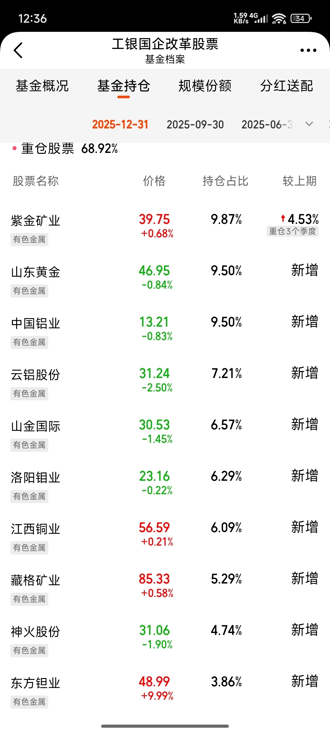 - 云铝股份(7.21%)、山金国际(6.57%)、洛阳钼业(6.29%)等,共同构成了以铜、铝、黄金、小金属为核心的资源组合。