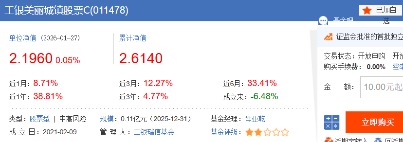 工银美丽城镇股票C为中高风险主题基金,聚焦美丽城镇建设相关板块,包括房地产开发、基建、建材、家电等产业链标的,其中房地产及产业链标的占比超60%,精准贴合2026年房地产板块复苏逻辑。从业绩表现来看,基金在板块回暖行情中展现出较强的弹性,同时风险控制能力优于板块内纯地产基金。