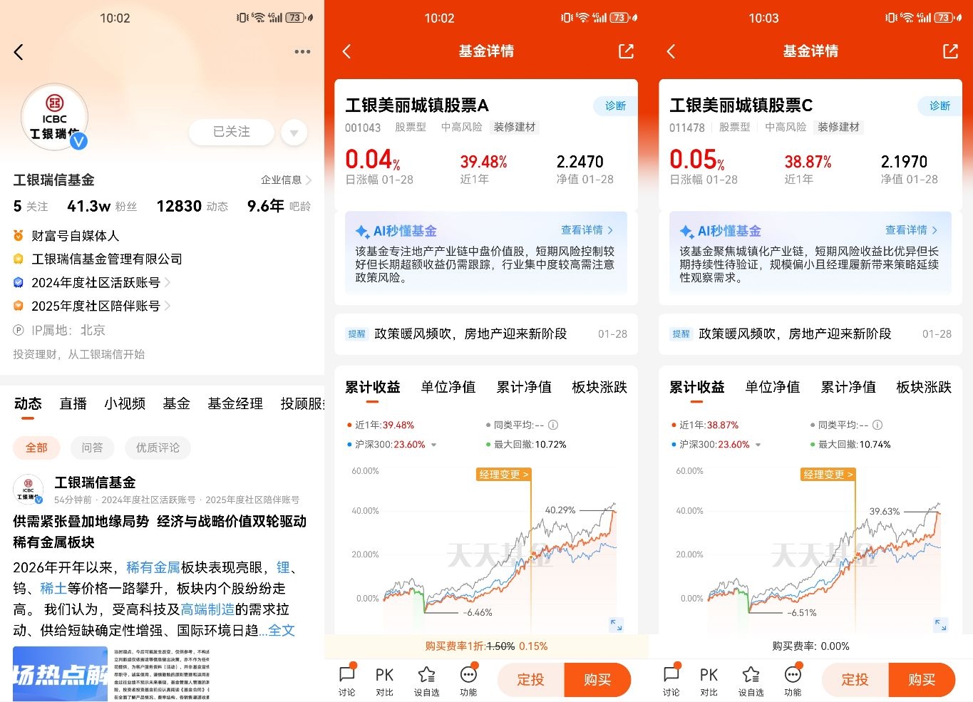 还有个小惊喜,它的购买费率是0%,新手试错成本特别低。虽然AI提示说基金规模偏小、经理履新需要观察,但从目前的表现和持仓逻辑来看,我觉得值得关注。已经果断把它和A类都加了自选,新的一年打算小额定投试试,希望能借着地产板块的东风,分享到产业链优质企业的成长红利~@工银瑞信基金