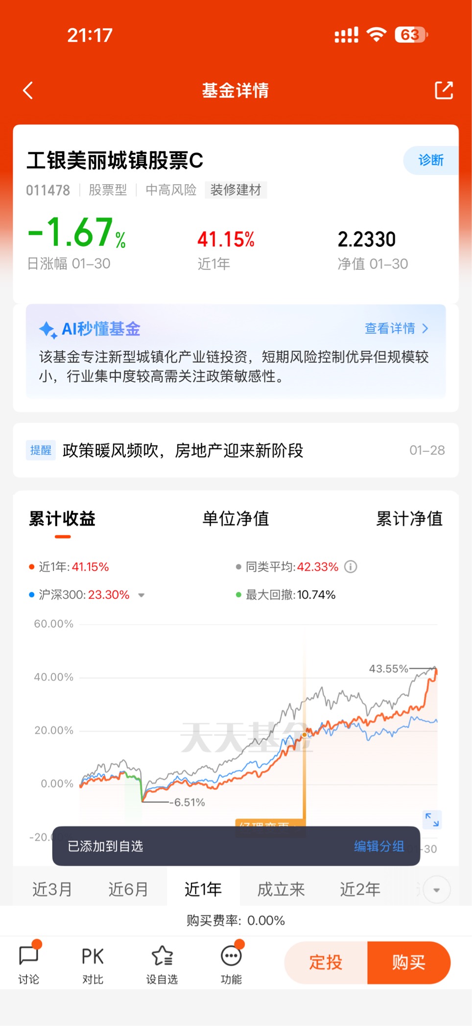 作为一只运作超十年的主题股票型基金,工银美丽城镇股票A的长期收益表现亮眼,同时在近期展现出强劲的增长动能。截至2026年1月29日,基金单位净值达2.3230元,累计净值2.7470元,成立以来累计收益率高达181.28%,穿越多轮市场周期实现资产长期增值。从短期业绩来看,基金的收益爆发力尤为突出:近1个月收益率13.04%,近3个月15.86%,近6个月36.89%,近12个月更是斩获44.20%的优异回报,在同类股票型基金中处于前列,充分体现了主题赛道的景气度与基金的选股能力。