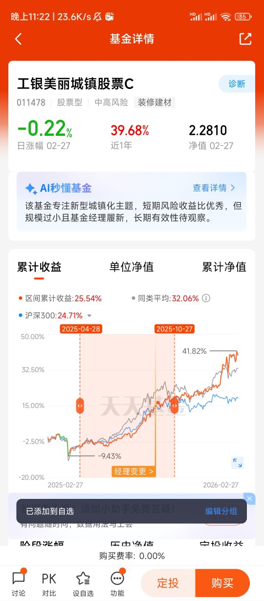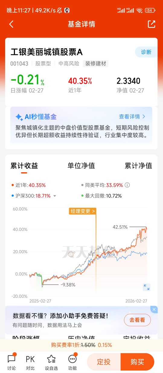 基于以上行业逻辑,我选择工银美丽城镇股票A,正是看中其精准的赛道布局和专业投研能力。该基金聚焦新型城镇化主题,重仓布局消费建材、家居用品、工程机械等地产产业链核心环节,完美契合本轮“优质房企+产业链龙头”的结构性行情。基金经理深耕地产产业链研究,擅长挖掘财务稳健、竞争力突出的细分龙头,在行业低谷期精准布局,有望在复苏周期中收获估值与业绩的双重提升。