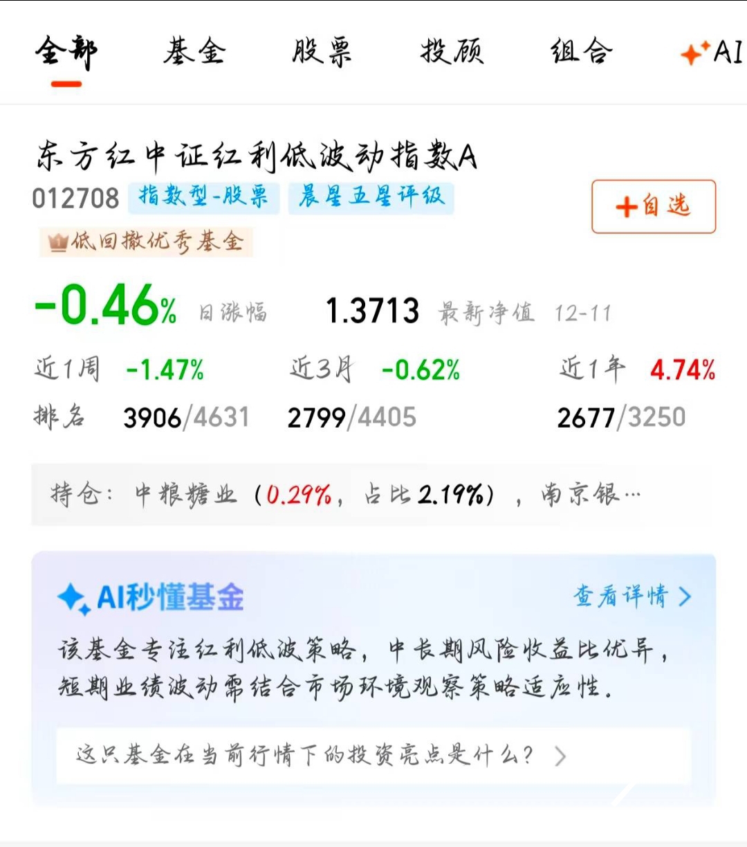 降息都要落地了,年底想安稳放钱的朋友真可以看看东方红中证红利低波动指数A,它靠红利+低波双策略稳得住,持仓又分散像个安全垫,近一年4.74%的收益不算低,现在市场回调正好低位上车太合适了。