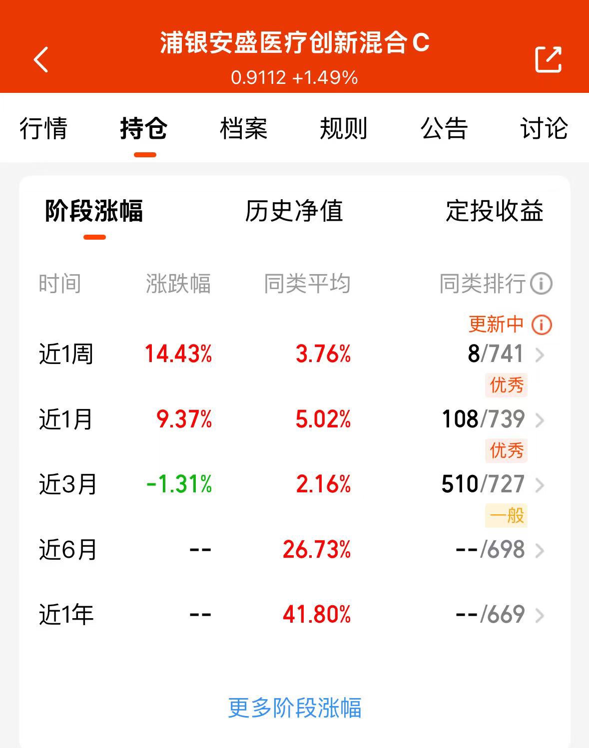 $浦银安盛医疗创新混合C$今天逆势上涨1.49%~这周涨疯了,还没上车创新药的注