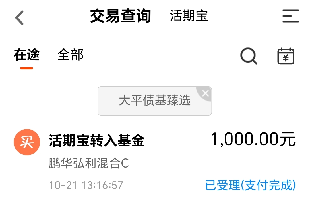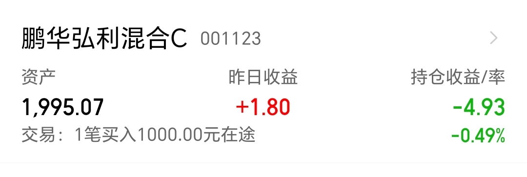 今天我买入$鹏华弘利混合C(OTCFUND|001123)$1000块钱。
