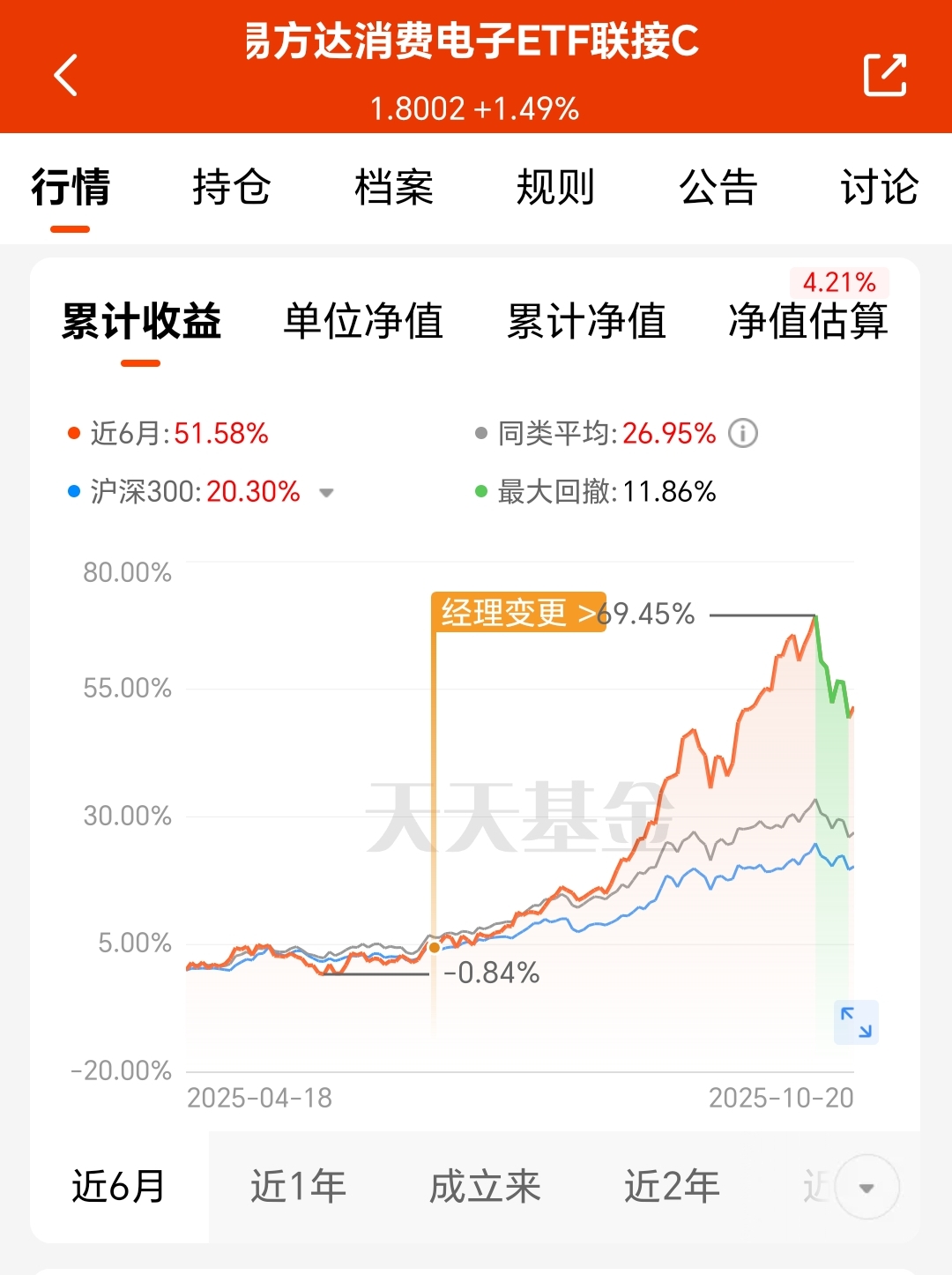 这个基金主要聚焦消费电子主题指数,涵盖了AI、内需、出海三大方向上的消费电子发展红利。它近6个月涨51.58%,大幅领先同类平均的25.75%,超额收益还是比较高的。