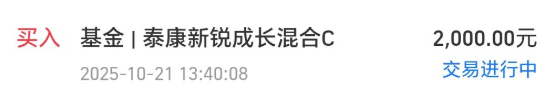今天我买入$泰康新锐成长混合C(OTCFUND|017366)$2000块钱。