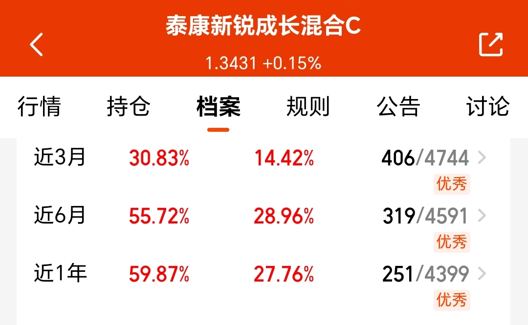 这个基金主要布局于科技和大制造领域,聚焦半导体等国产替代和产业升级的行业。它近3个月涨30.83%,近6个月涨55.72%,弹性挺高的。在当前这种牛市行情里,我觉得这种科技成长风格的基金可能会有更多的超额收益。