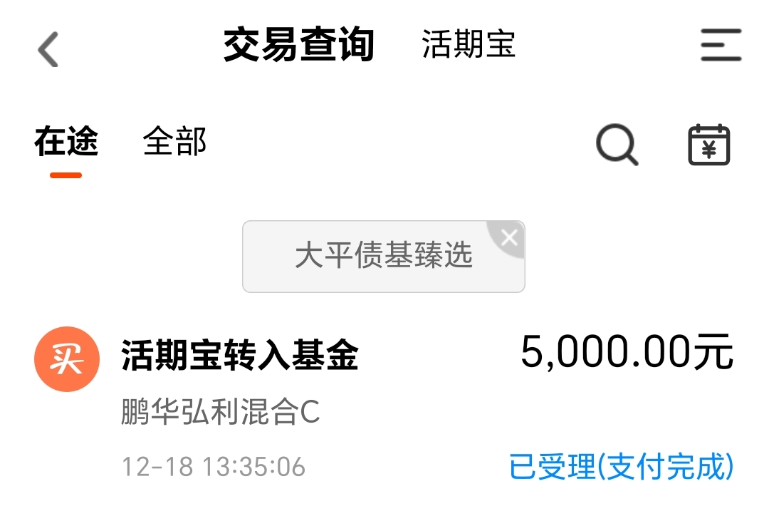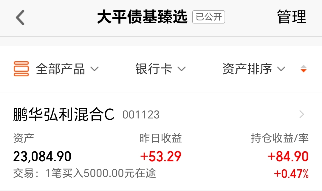 今天我买入$鹏华弘利混合C(OTCFUND|001123)$5000块钱。