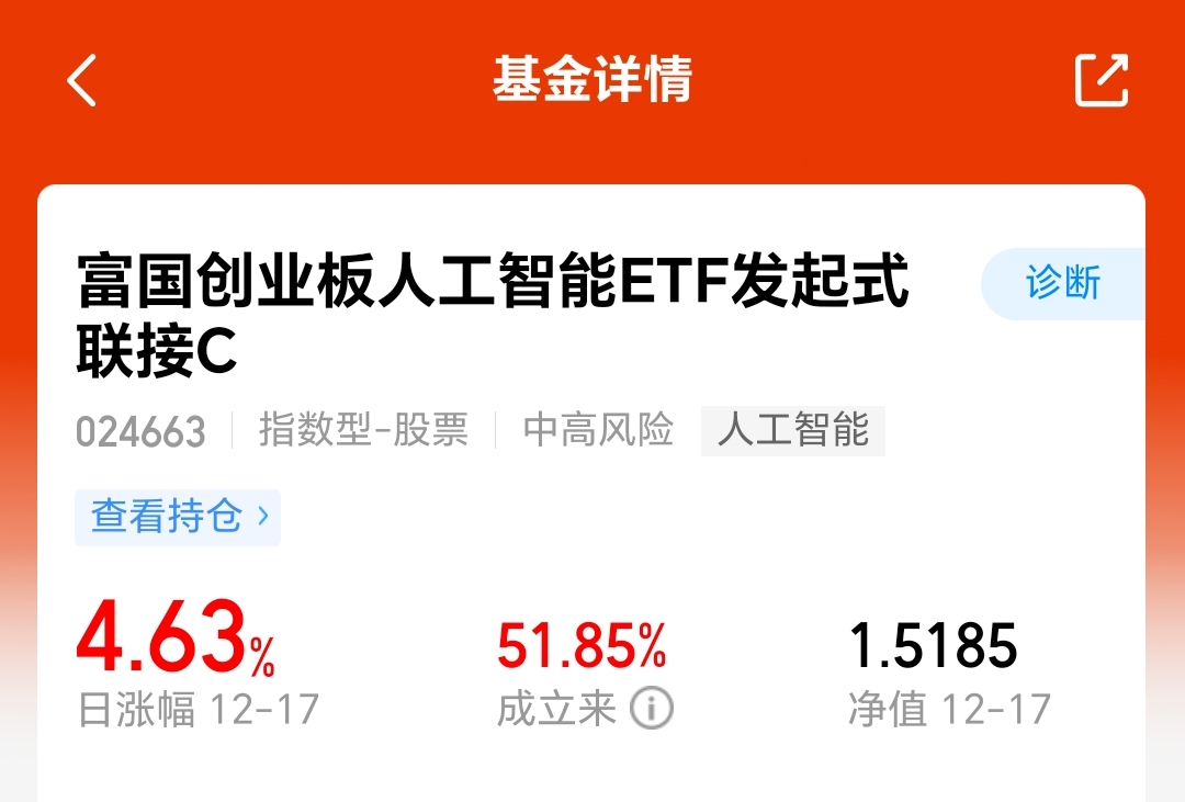 这个基金主要跟踪创业板人工智能指数,聚焦投资于AI产业链,包括CPO等人工智能核心环节。我目前持仓盈利超7%,它成立以来不到半年时间涨超51%,还是非常优秀的。