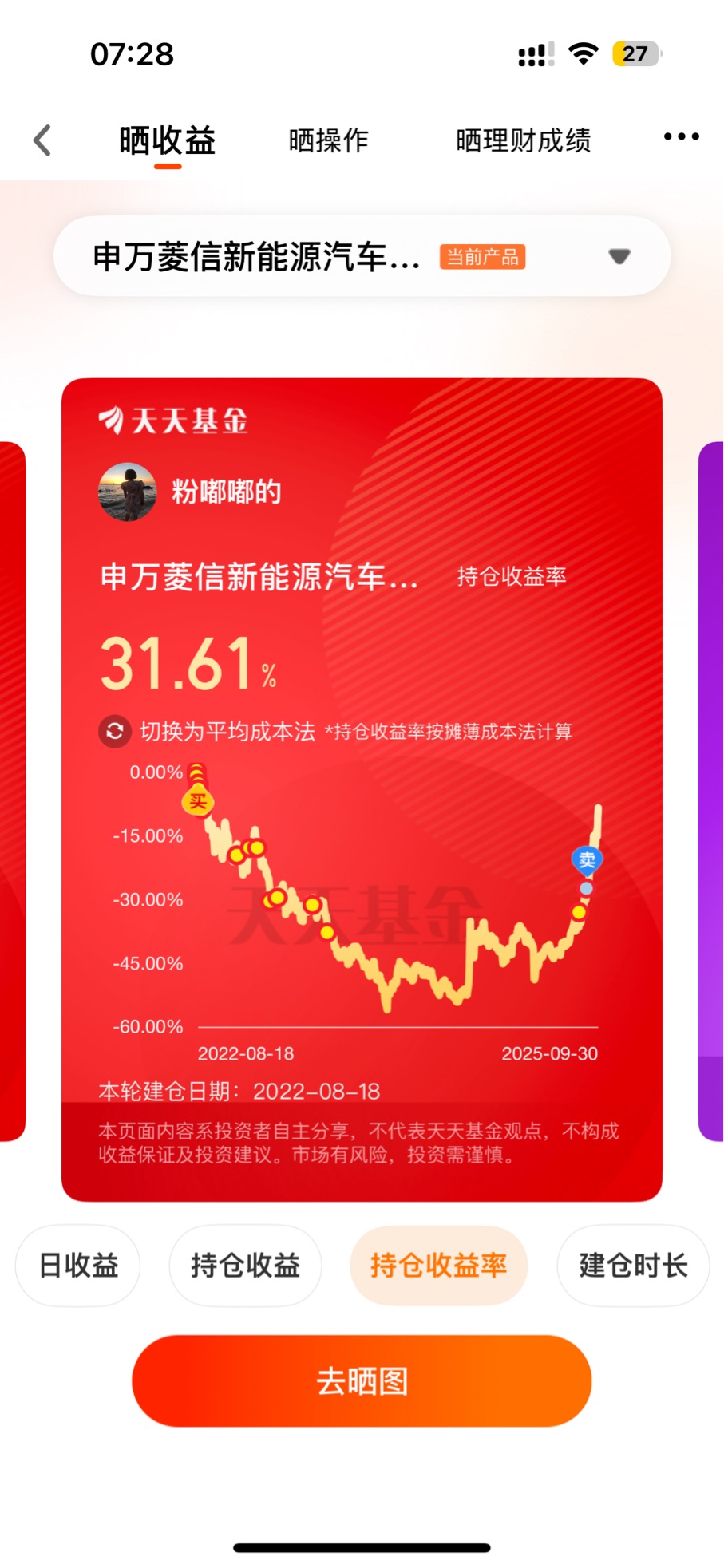 这只基金持有3年了,基本买在山顶一直亏损,,23年之后基本没怎么补仓,最高亏到43个点了。。今年8月行情看到突然好起来了,就开始加倍补仓,8月底回本了,现在盈利31个点,,9月初还卖了一半仓位。几年下来发现真的割肉真的不明智。玩基金真的要闲钱来玩,要不然心态就乱了