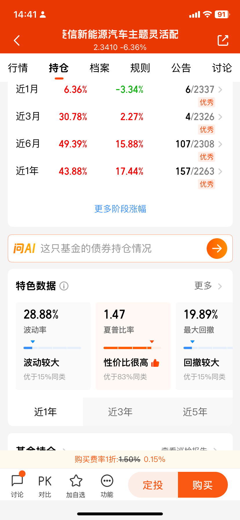 今天股市午后拉升不少,目前指数集体翻红,其中我注意到$申万菱信新能源汽车主题灵活配置混合A(OTCFUND|001156)$整体表现不错,其持仓高度聚焦新能源汽车产业链,电力设备行业持仓占比46.97%,深度布局电池、电机等核心环节,近1年收益率43.88%,业绩表现亮眼,采用主动分散化投资策略,前十大重仓股占比68.47%,兼顾集中配置与风险分散,后市值得看好啦!#军工板块活跃!机构:行业或迎业绩拐点#