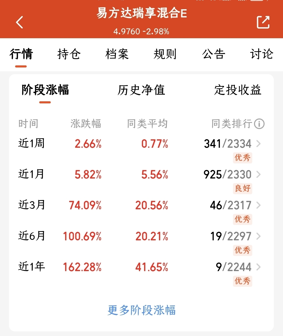 $易方达瑞享混合E$ 基金经理前瞻性强,十年来精准把握成长机遇。该基长期表现稳健,在成长行情中展现出强劲爆发力,超额收益显著。其投资策略灵活有效,风险控制得当,业绩持续跑赢同类产品,为投资者创造了优异回报。该基金凭借出色的选股能力和市场判断力,在成长风格主导的市场环境中表现尤为突出。