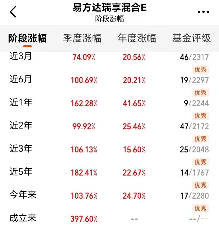 A股今天指数有所分化,沪指尾盘翻绿,深指和创指涨幅不错!$易方达瑞享混合E(OTCFUND|001438)$这只老牌及成立以来成绩不错,收获397.60%的业绩涨幅。基金经理前瞻力拉满,总能抓住不少的成长机会,爆发力远超同类,走势很稳呀。在长期增值和超额收益这一块我觉得做得很棒呀!