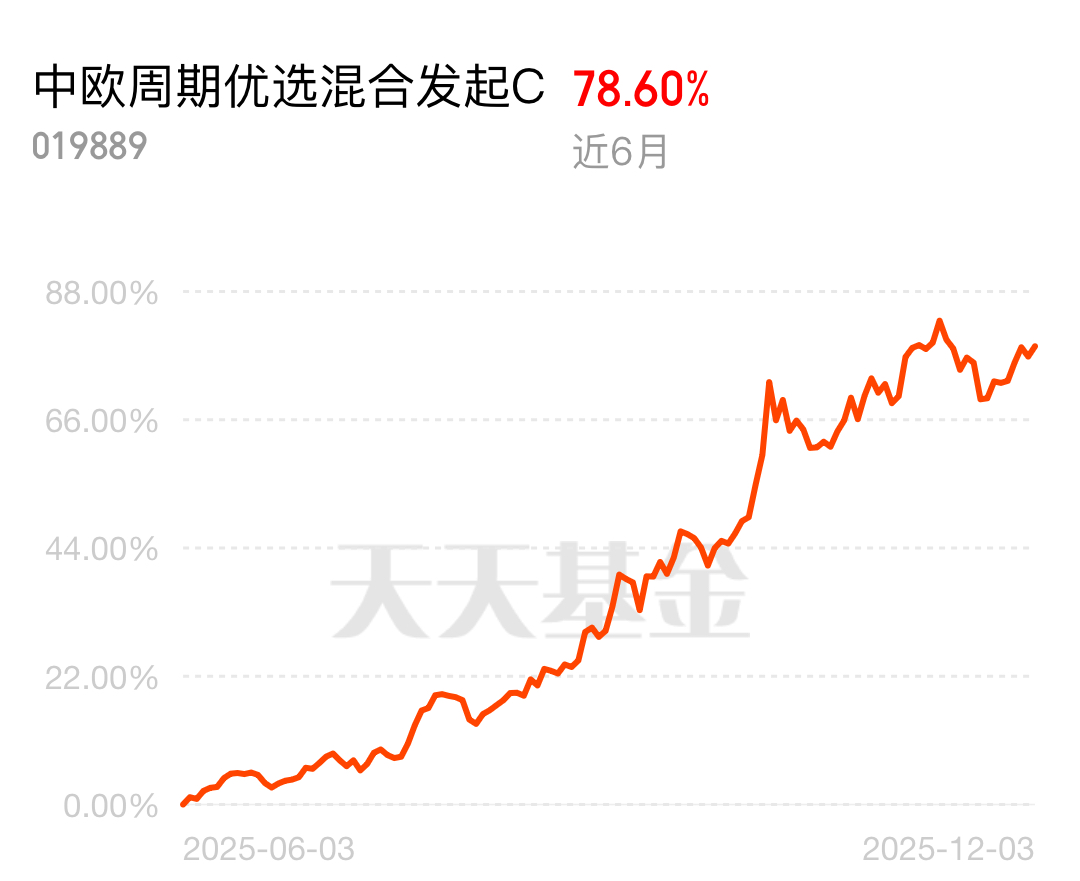 年末基建投资冲刺,各地项目集中开工,上游工业金属需求瞬间拉满,周期股行情彻底点燃。中欧周期优选混合发起 C 近 6 个月 78.60%,重仓资源标的,收益稳稳的。