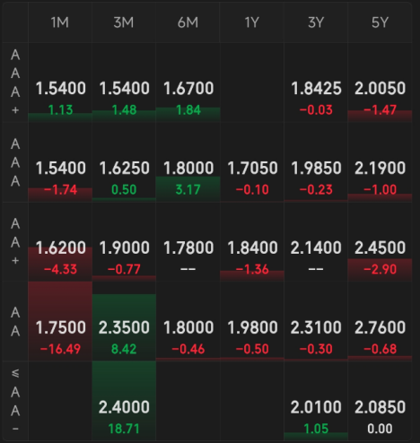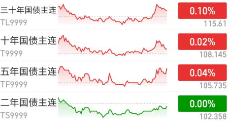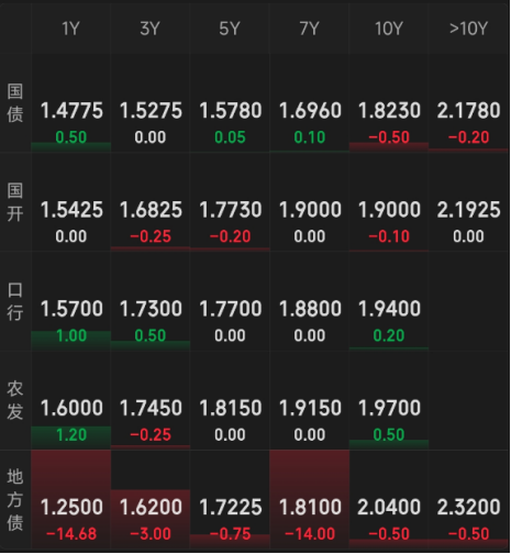 债市今天走出了V字行情,上午高开低走一路下行,午后回升,临近收盘有回落,盘后继续回暖。目前整体涨跌互现,且红盘多集中在中长端。