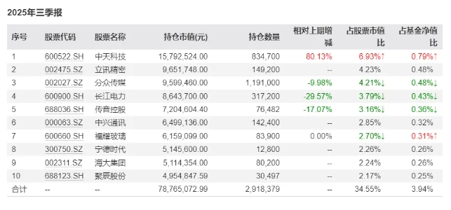 最新三季报里前两大持仓股是中天科技和立讯精密,并且加仓了中天科技。