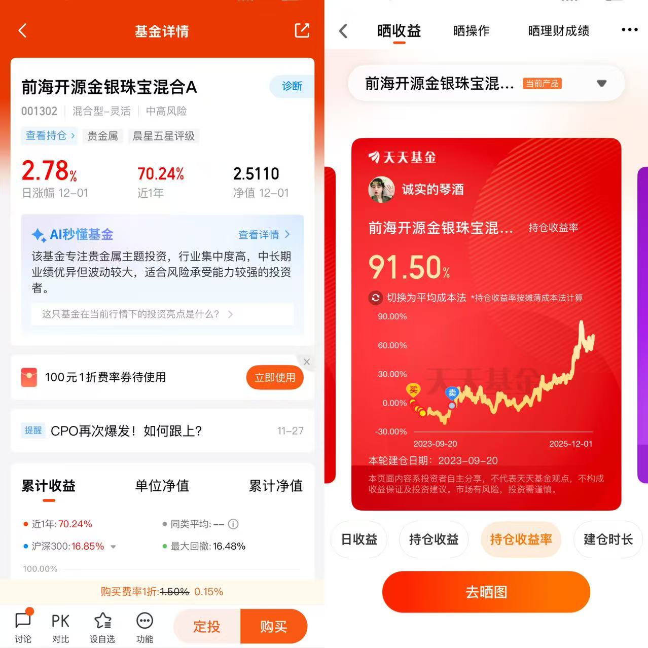 $前海开源金银珠宝混合A(OTCFUND|001302)$去年年底那会儿,A 股跌得我都不敢打开账户,想着得找个避险的东西平衡一下。对比了纯黄金 ETF、黄金股票基金,最后选了前海开源金银珠宝混合 A。因为它不只是单纯买黄金,还持仓了像老凤祥、周大生这样的珠宝龙头股,还有一些黄金矿业公司的股票,相当于 “黄金商品 + 珠宝消费 + 矿业成长” 的混合配置,比纯黄金 ETF 多了点弹性,又比单买黄金股稳一些。