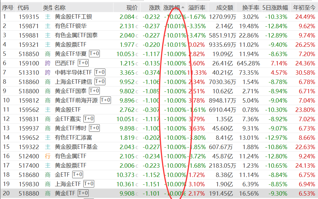 这场史诗级回调不仅重创商品市场,更迅速传导至A股。周一黄金、白银概念股集体扑街,多只个股跌停,整个有色金属板块领跌大盘,场内一堆黄金、有色ETF跌幅达10%。