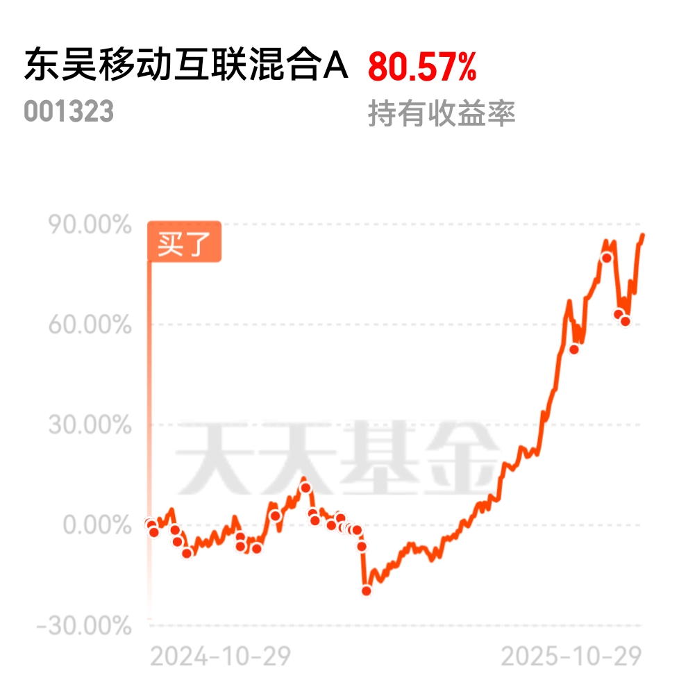 九月结束时,近一年涨幅好像是110%左右!从累积收益图上看,这次已超越九月份了,但近一年收益没上110%!我的收益也同样如此,没跌之前收益大约95%左右,现在是80%!我倒是中间加仓了几万元!但微乎其微请明白人解释一下!$东吴移动互联混合A$