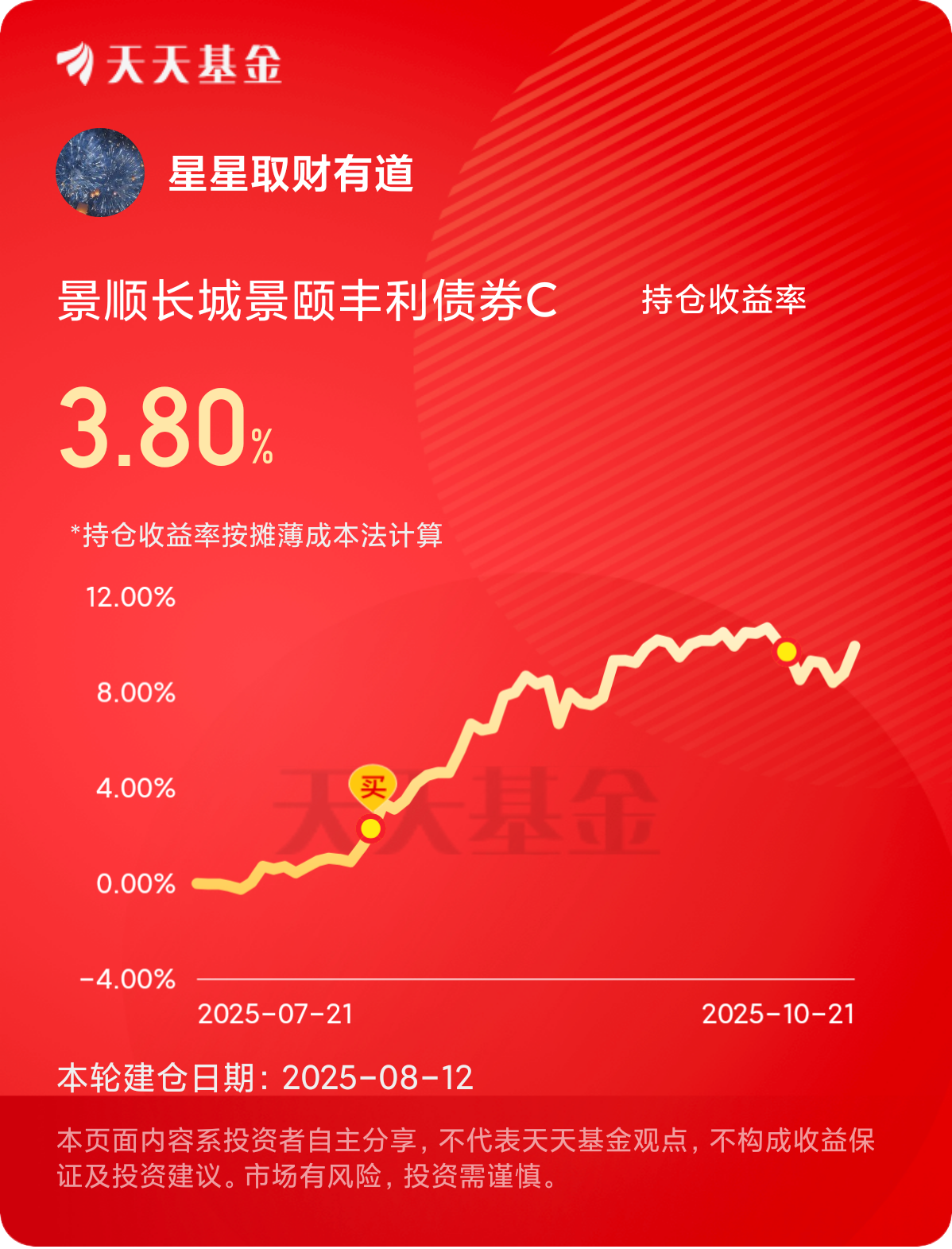 我买了江山的固收+$景顺长城景颐丰利债券C$ ,昨天居然也涨了1%,混债基金里面很牛了,不敢上车的可以看看他管的混债#晒收益#