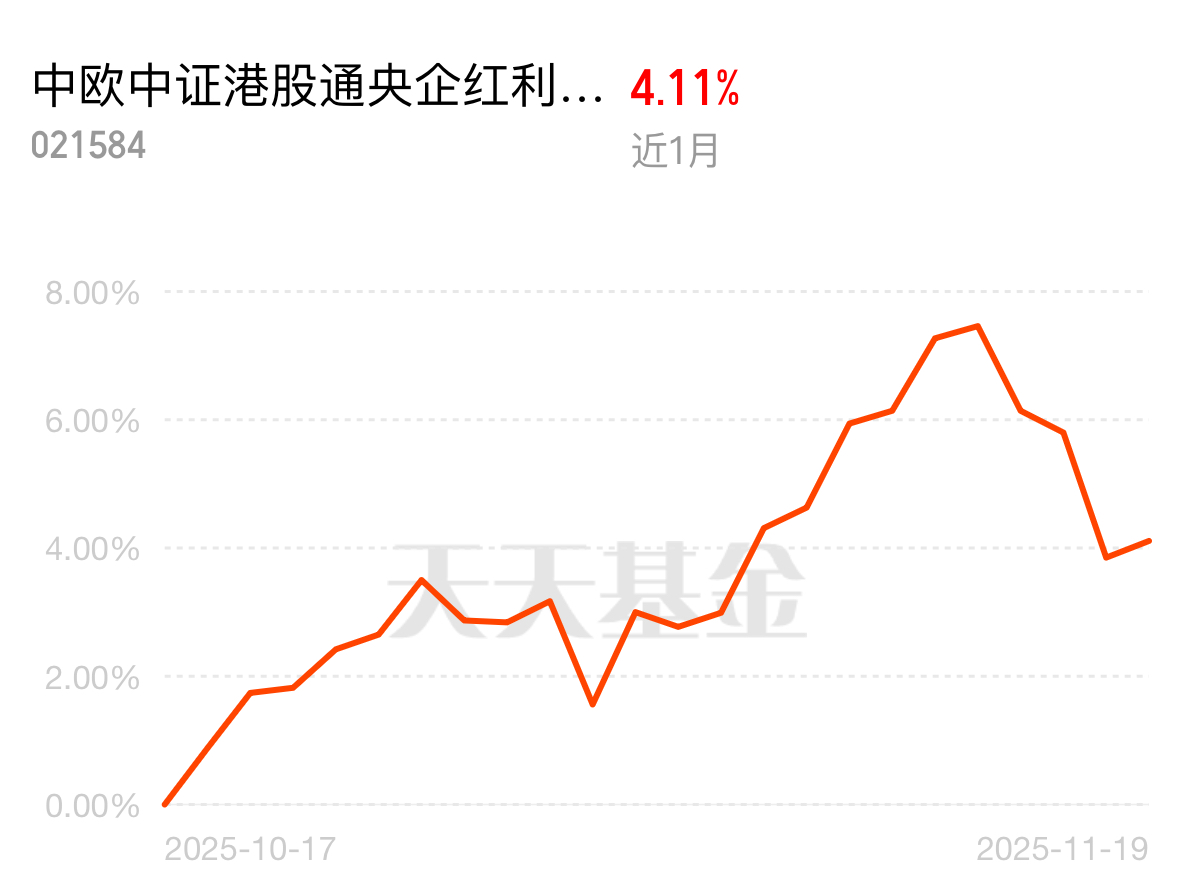 现在港股估值处于历史低位,优质央企资产性价比突出。中欧中证港股通央企红利指数(QDII)C近1个月涨4.11%,紧盯港股通央企红利标的,分红稳定且波动小,既能把握估值修复机遇,又能靠稳健表现提升持有体验。