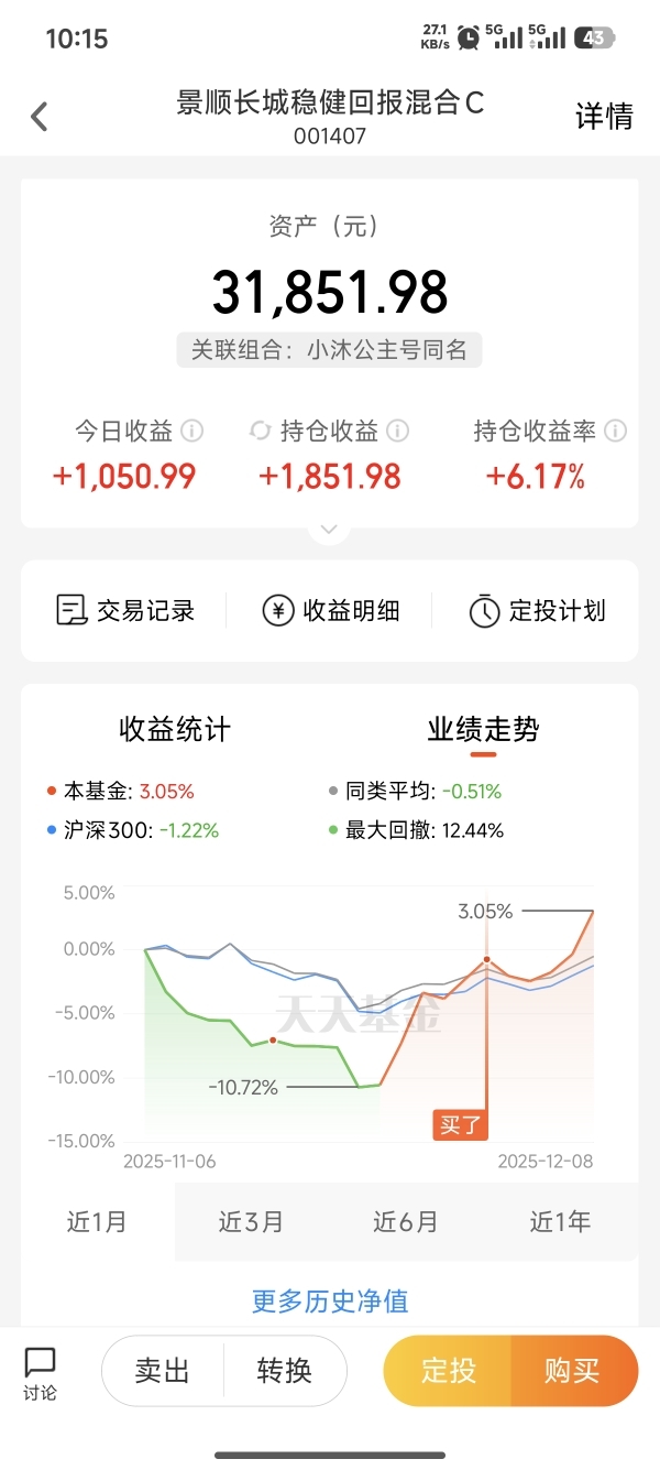 今天这波通信设备大涨直接带飞了$景顺长城稳健回报混合C$ 景顺长城稳健回报混合C!打开账户一看,资产已经到31851.98元,今天单日收益+1050.99,持仓收益率稳在6.17%——这波布局算是踩准了节奏。