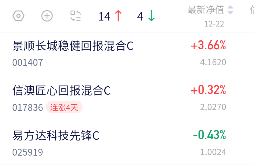 最近行情持续反弹,收益拉升不少呢。稳健类选手表现更加突出。$景顺长城稳健回报混合C(OTCFUND|001407)$昨天上涨3.66%,恐龙蛋啊。厉害。