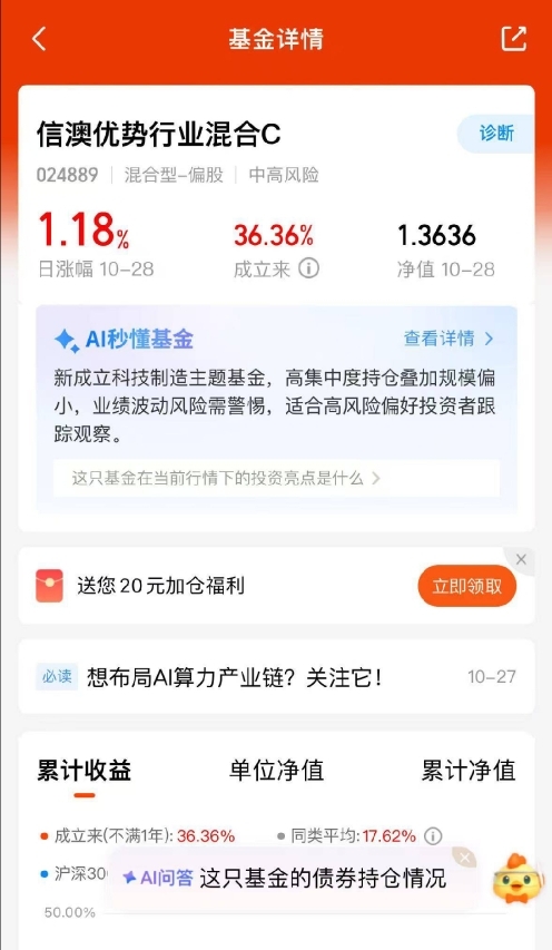 信澳优势行业混合C弹性十足,成立一年不到涨幅近36.36%,这只以“CPO概念”