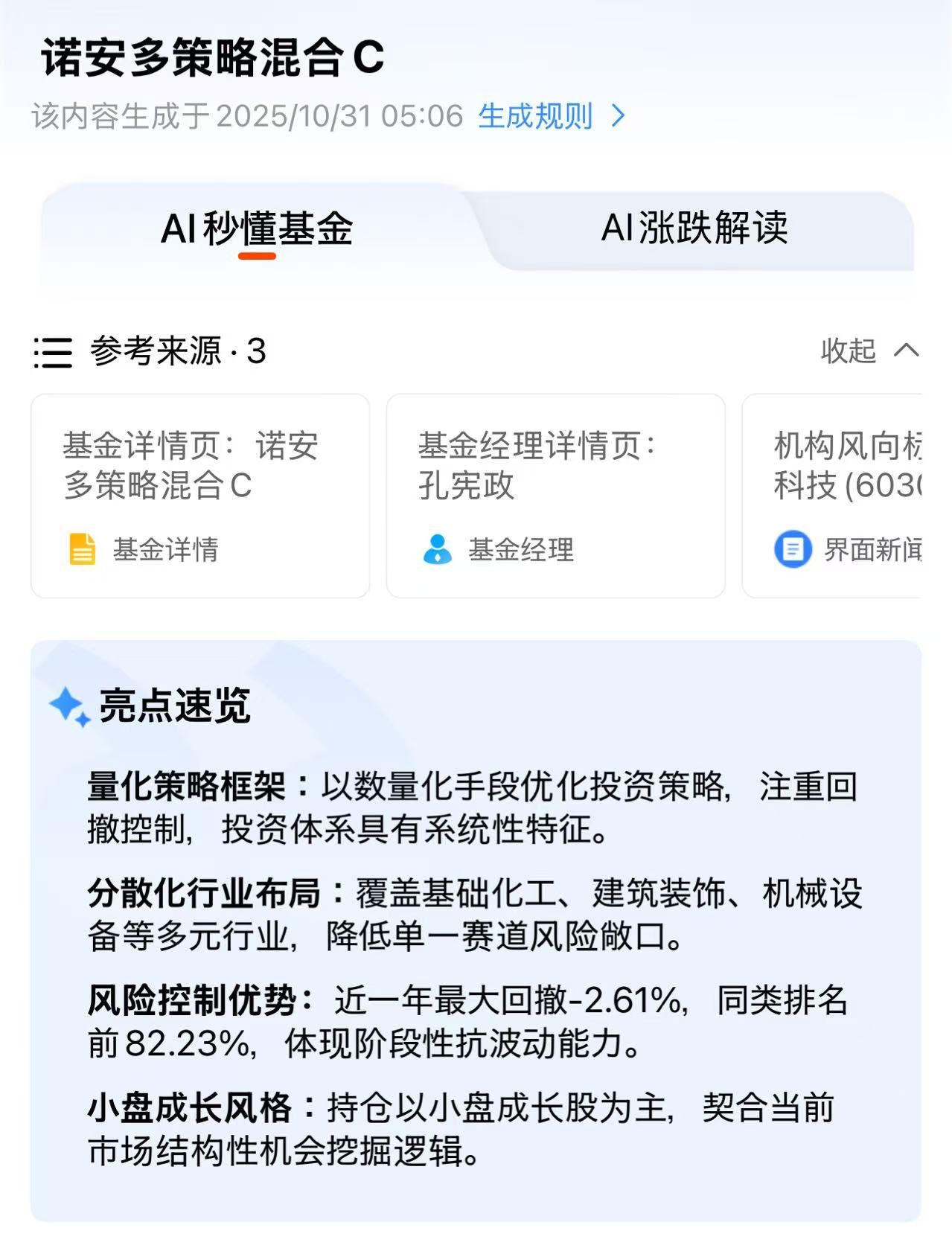 诺安多策略混合C(023350)创新高已是家常便饭。开个玩笑,这种“习惯性优秀”,背后是强大的策略护城河和专业的投研团队。在波动巨大的市场里,能找到这样一款持续创新的产品,真是我们的幸运。#11月基金投资策略#