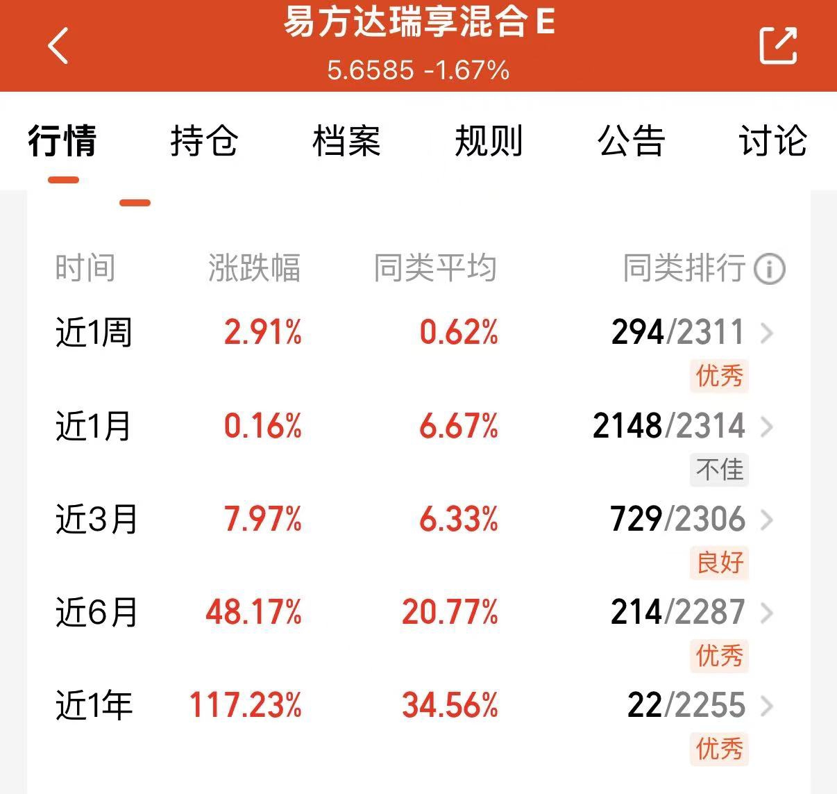 今天A股震荡,不少人都被震下车了。还好我拿着易方达瑞享混合E,它专门搞CPO和上游产业链那一块,算力基建占了大头。这种行情下它估值还能跑赢同类,近一年赚了117%,这收益太提气了,看来经理的本事大家都有目共睹。