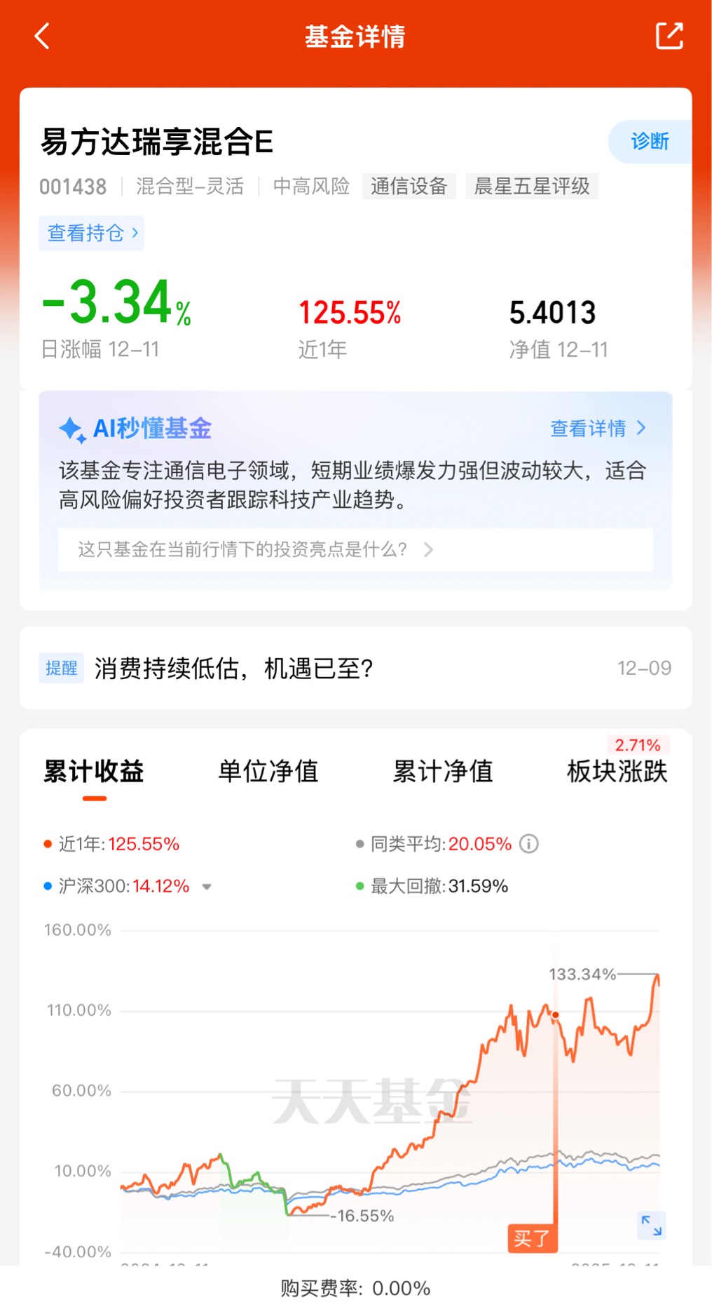 在此行情中,$易方达瑞享混合E$ 展现出较强把握力,近期涨幅明显优于同类,$易方达瑞享混合I$