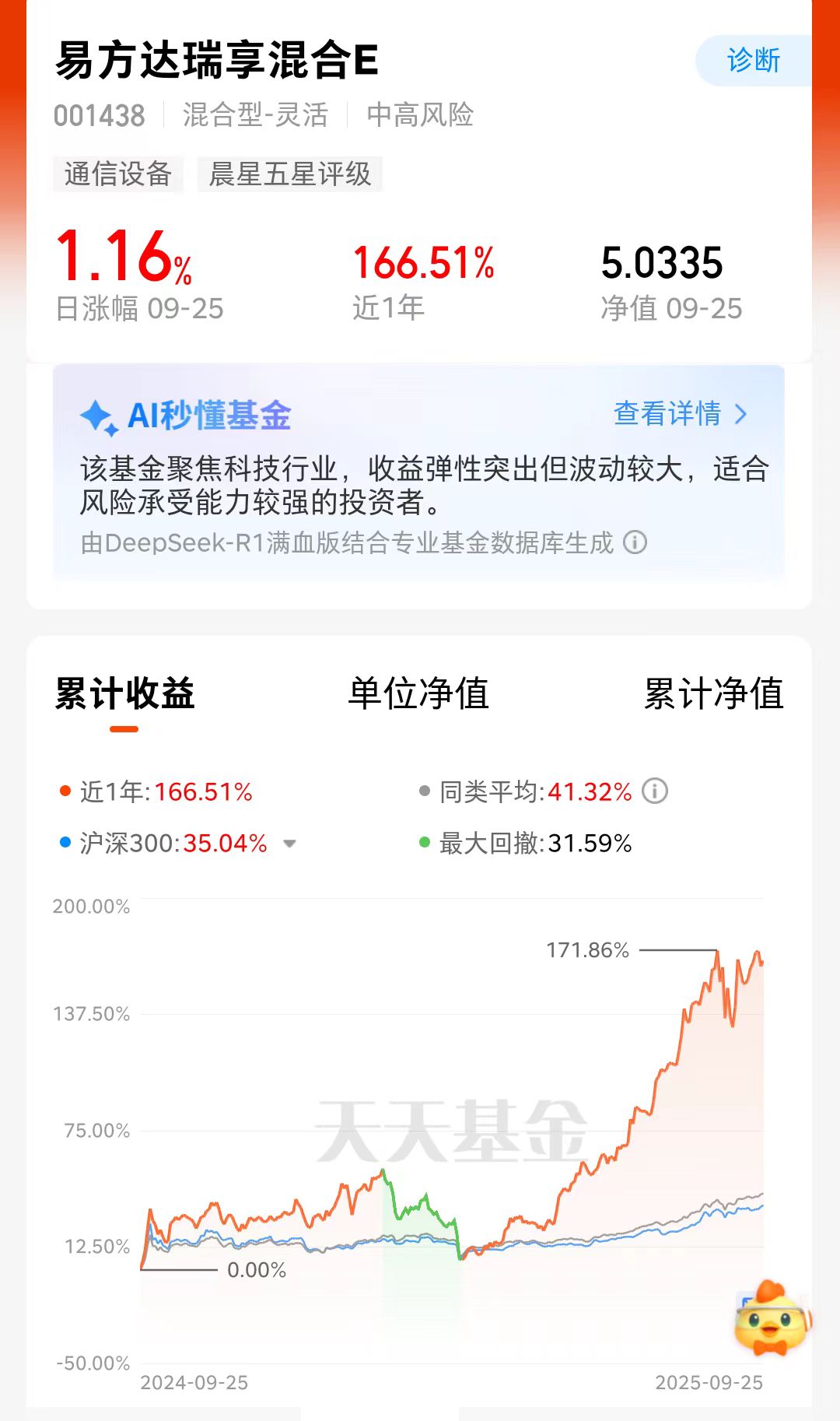 近期科技板块也继续反弹,算力需求得到验证,CPO行情重新启动,$易方达瑞享混合E(OTCFUND|001438)$的基金经理就是提前布局了这个赛道,已经吃过一轮上涨行情了,基金经理前瞻能力强,成立来10年里紧密把控成长机会,长期走势强、在成长行情下爆发力强,比同类都优秀呢,安心看长期