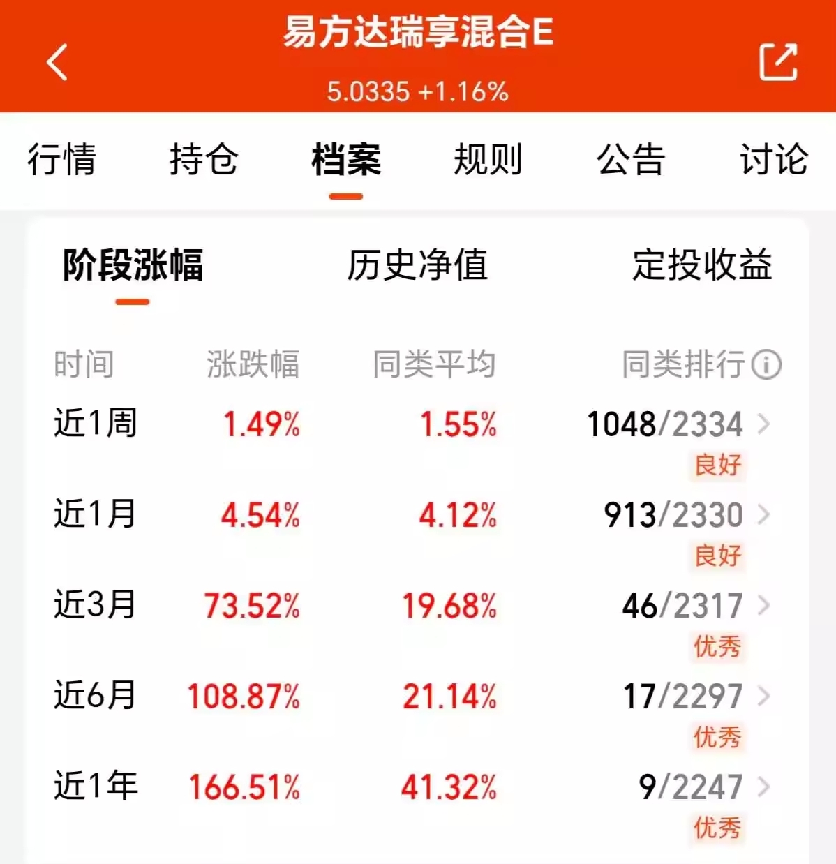 今日市场行情出现分化,创业板跌幅超1%,不过涨涨跌跌才是健康走势,我仍然看好大科技赛道方向,其中$易方达瑞享混合E$ 作为一款多年老牌基金,自成立以来涨幅超400%,持仓以成长型赛道为主,所以爆发能力很强,基金经理的个人能力也非常出色,能够及时灵活调仓,捕捉市场趋势,所以我也果断上车一波,相信长期持有的力量!