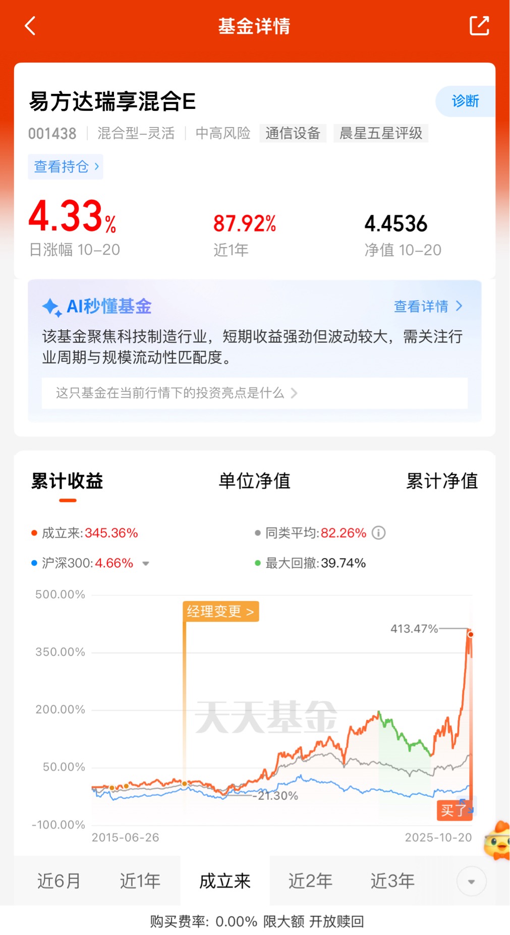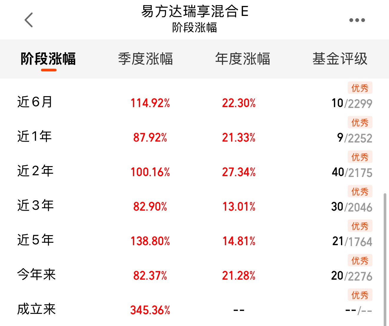 基金经理投资能力卓越,其管理的易方达瑞享混合成立以来收益达381%,过往调仓坚定果断,业绩持续优异。