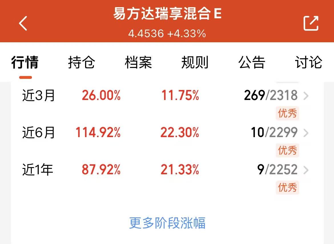 今天A股延续反弹啦,科技赛道表现亮眼,CPO大涨起来咯,看来新的一轮行情啦了,$易方达瑞享混合E(OTCFUND|001438)$估值上涨4.9%,近三个月涨幅26%,近六月涨幅114.92%,业绩优秀,盈利强,经理的管理调仓能力也是非常强的,眼下经过回调,目前还在低位,我觉得可以继续看涨哟!