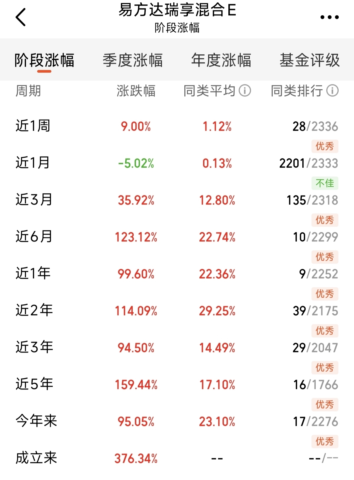 太给力了。科技主线回归。CPO再度迎来爆发。$易方达瑞享混合E$ 这只主动科技基金昨天上涨了6.96%。爆发力的表现是真的强。而且遇到波动稳定性也是不错。基金经理的个人能力非常强。每次做到一个精准调仓。管理该基金以来,基金净值已经近400%,长期稳定收益的能力强。我非常看好未来的成长表现。今天准备继续布局。