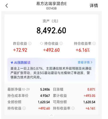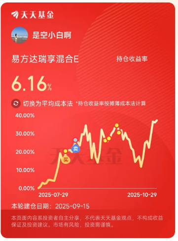 厉害了!$易方达瑞享混合E(OTCFUND|001438)$再创新高,持仓体验实在是太香了!它精准押中了光模块这条市场主线,新易盛、中际旭创这些光模块龙头都是重仓股,大科技是国家政策力挺的方向,资金特别认可。平时遇到调整也不用慌,跌下来就是送机会,很快就被资金拉上去创新高。入手后我就发现了,收益跟开了挂似的,近6个月涨了142%,近1年涨了116%,同类排名,盈利效应直接拉满。