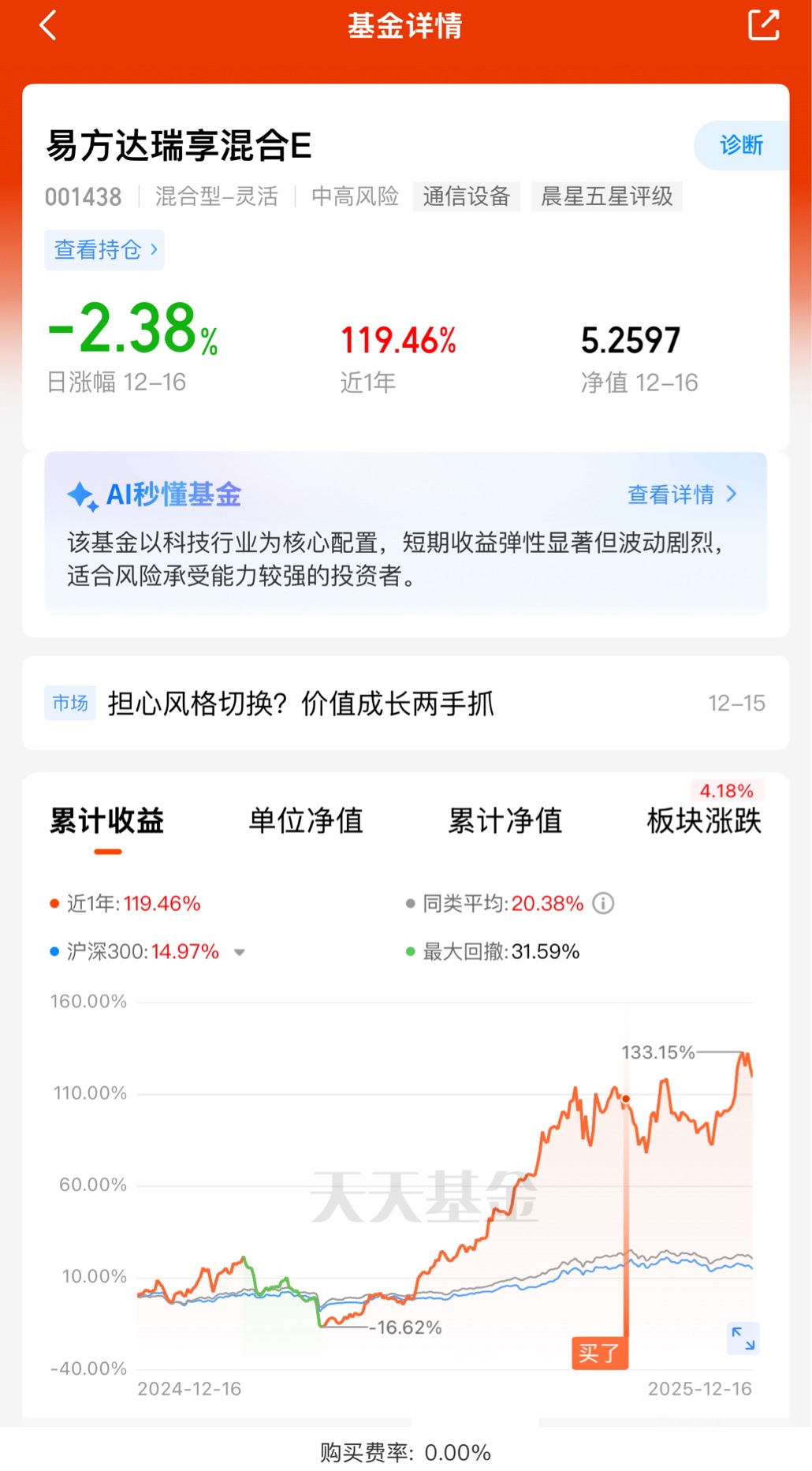 今日CPO板块强势领涨,新能源在“反内卷”中聚焦创新突破。作为持有标,$易方达瑞享混合E$ 的体验很直观: