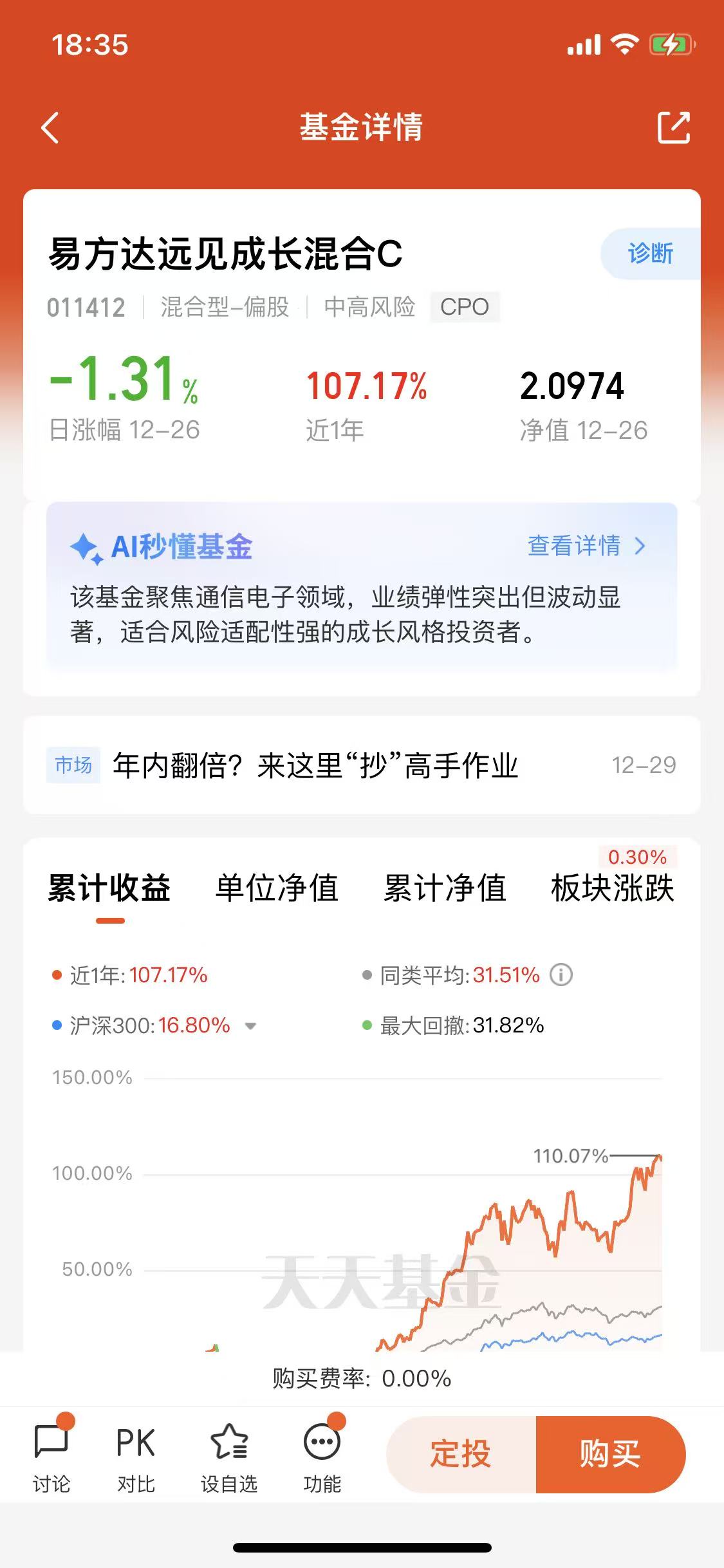 基金经理武阳先生出身经济学科班,从行业研究员到基金经理的进阶之路积淀深厚,选股逻辑严谨,眼光独到。更显诚意的是其亲民费率,持有满30天即可免除赎回费,对普通投资者尤为友好;加之背靠实力雄厚的易方达基金,更添一份安心。当下不妨静待合理低位,择机布局,方能紧跟CPO板块的下一轮成长浪潮。