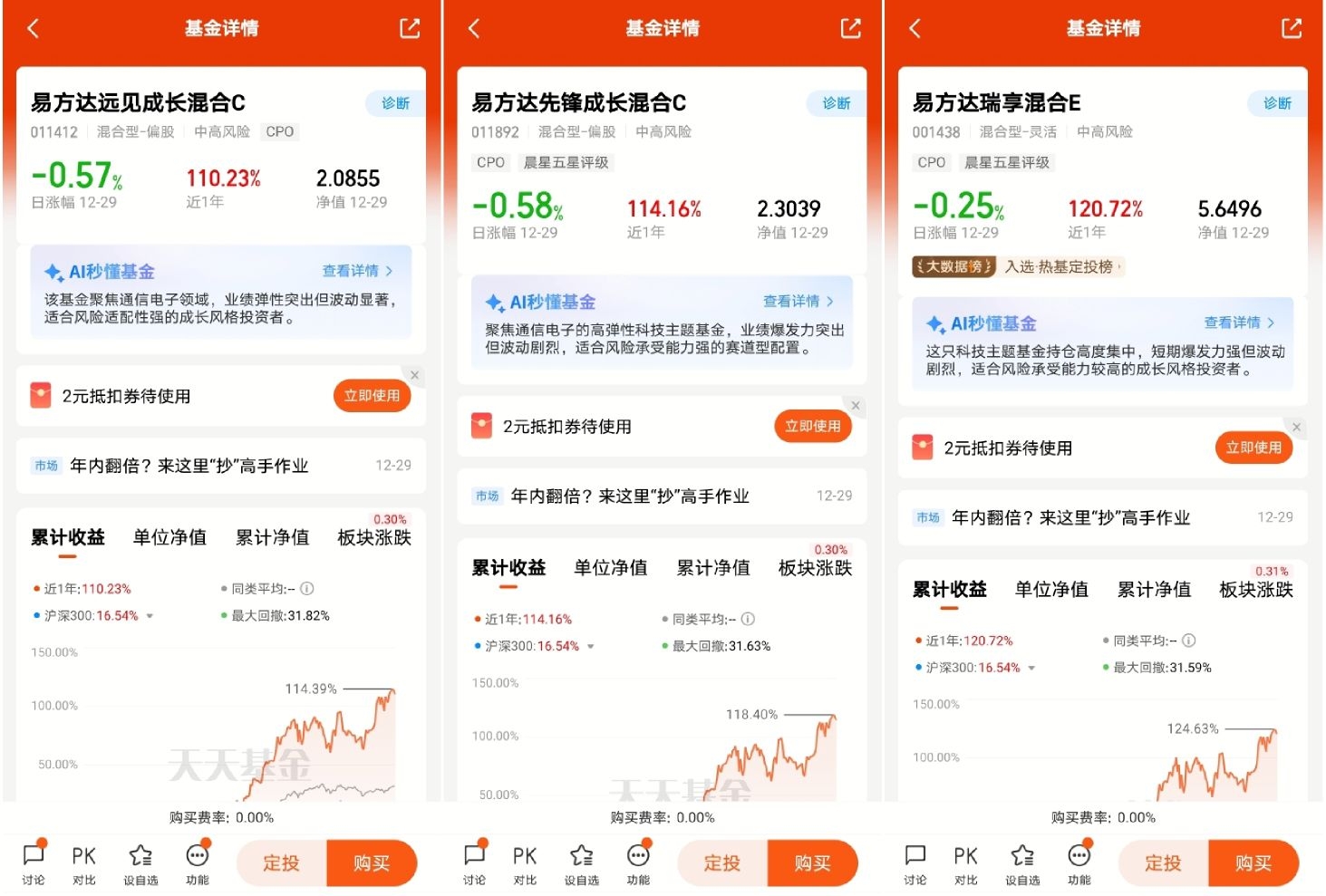 对于普通投资者来说,想要参与CPO板块的投资,通过布局相关基金,如$易方达瑞享混合E$ 也是一个不错的选择。基金就像是一个装满各种宝藏的百宝箱,它汇聚了众多投资者的资金,由专业的基金经理进行管理和运作。基金经理凭借其丰富的投资经验和专业知识,能够筛选出CPO板块中具有潜力的优质企业进行投资,为投资者省去了自己研究和挑选个股的麻烦。而且,基金的投资范围广泛,可以分散投资于多只股票,降低了单一股票投资带来的风险。通过投资CPO相关基金,普通投资者可以借助专业力量,分享CPO行业发展的红利,实现财富的稳健增长。