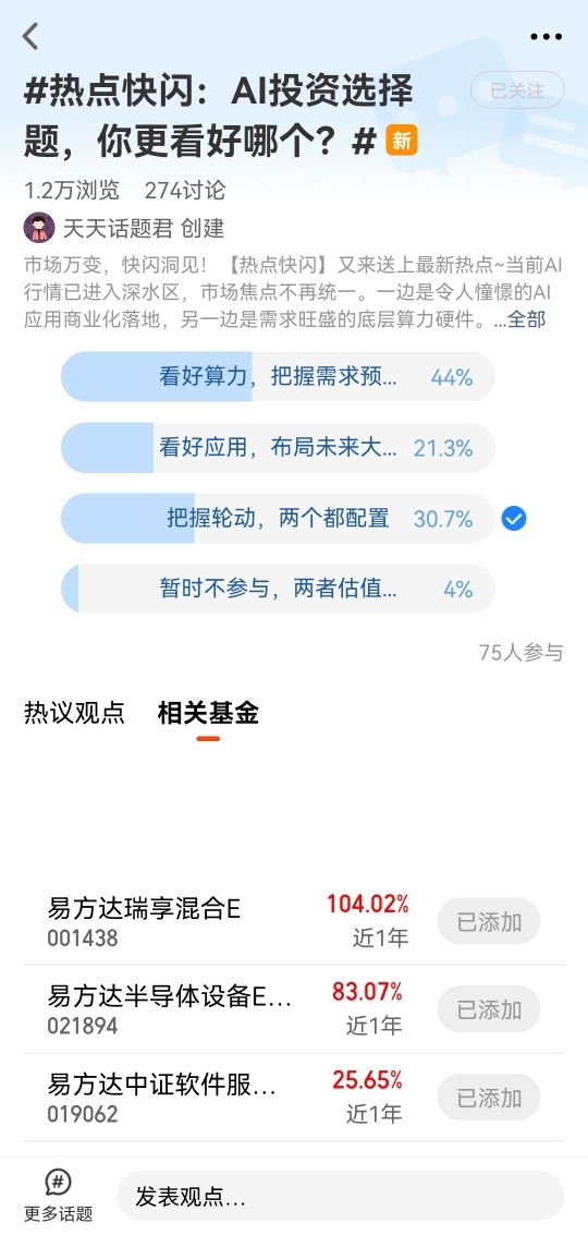 我在#热点快闪:AI投资选择题,你更看好哪个?# 选择了“把握轮动,两个都配置”。人工智能盛大开局,越战越勇,推动着人类文明更进一步,在这个过程中,算力是基础设施,应用有开拓发展大空间,二者可以说是相辅相成的,AI最终会落归于实际应用上,但应用的应用上更离不开算力基建,与其眼看二者在轮动中起爆,不如寻找低吸点及时切入。