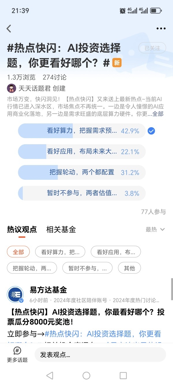 我在#热点快闪:AI投资选择题,你更看好哪个?# 选择了“看好算力,把握需求预期”,随着人工智能的快速发展,不管是在软件层面,还是硬件层面,不管是算力层面还是数据层面,对应的需求量大概率会出现比较明显的增长的。特别是在算力这个部分,现在非常适合做投资,现在的人工智能已经进入了一个加速发展的阶段。而在人工智能发展的那么多年里面,它在不同的领域已经得到了广泛的认可,比如在人脸识别,图像识别,还有文本,它在应用端的反应都不错。而今年出现的通用的大语言模型,让我们进一步感受大了原来人工智能它的归纳与判断能力以及推理能力是如此强大,虽然其中有一些现象还无法用比较顺畅的逻辑去解释,目前很多科学家也在对此进行分析与研究,而这恰恰意味着它的天花板是极其高的。而随着现在国内与国际的科技巨头都在推出自己的模型,而且还在以一种非常快的速度去迭代它,可以说现在全球的科技巨头都已经在花很多的精力在人工智能这块上了,而在这个过程里面,它必然会给产业带来巨大的变化。一旦变化多了,那意味着的投资机会也大了,但在产业发展的不同阶段,不同产业环节的机会与确定性是不太一样的,我认为比较重要的是算力,因为它是人工智能行业发展的“源头”,现在我国一些主营算力的企业的许多订单都已经出现了供不应求的局面了,而且在这之后可能是各种应用端的机会,包括是中层的模型设计与开发,它会给后续的很多产业链带来很大的机会。@易方达基金