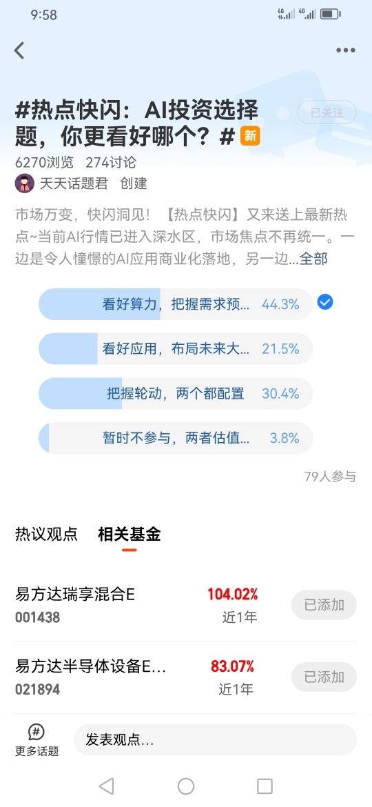 我在#热点快闪:AI投资选择题,你更看好哪个?# 选择了“看好算力,把握需求预期”,人工智能的算力,算法和数据是市场关注人工智能的三个方向,具体来说,算力是衡量计算设备执行算法,处理数据的能力,关系到系统的运行效率和任务完成速度。所以相关的数据中心,云计算,边关计算,高性能计算,分布式计算等这几个细分行业会受益;算法是解决问题,实现特定功能的有序指令和步骤,是计算机程序的基础,用于实现各种功能,所以相关的自然语言处理,计算机视觉,推荐系统等,机器学习等这几个细分行业会受益;数据是对现实世界的描述和反映,以数字,文字,图像等形式表现,是支持决策和优化的基础,所以相关的数据可视化,数据分析,数据挖掘,数据仓库,隐私保护等等这几个细分行业会受益。@易方达基金