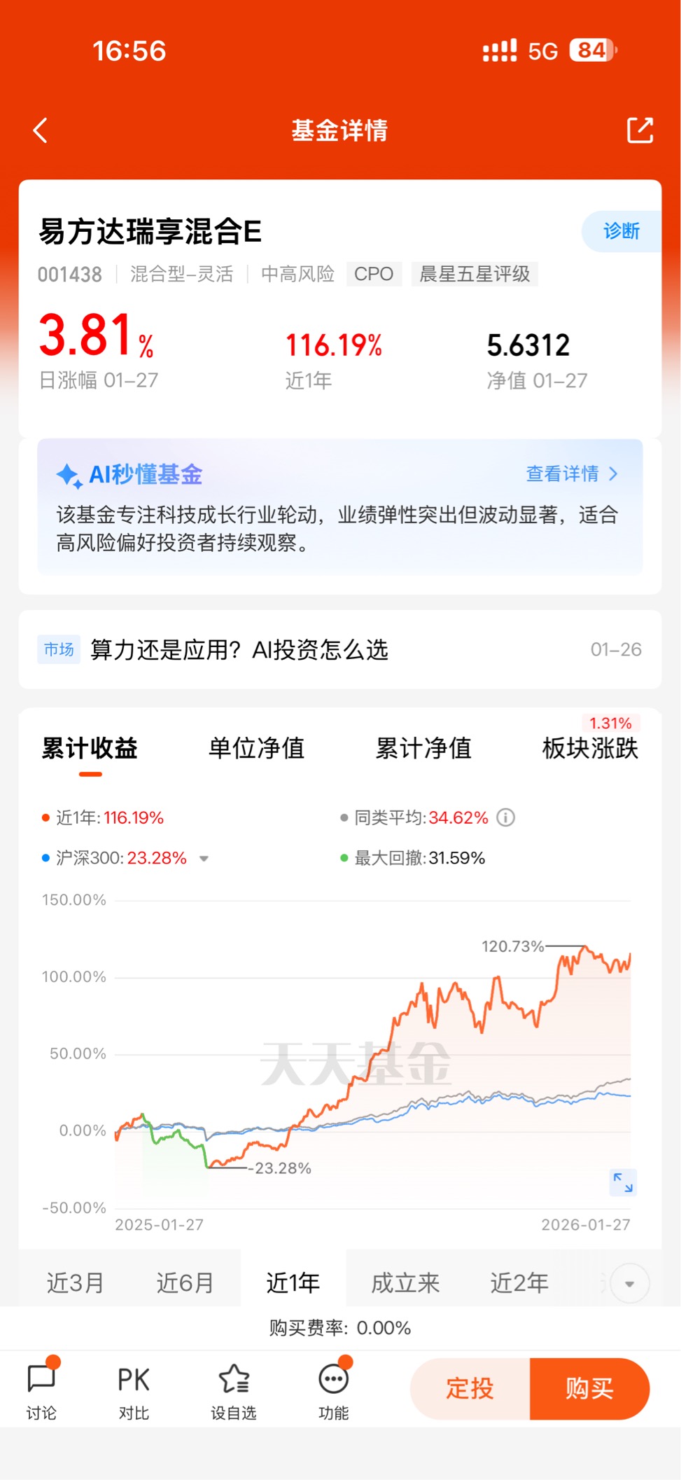 极致的产业布局,造就了易方达瑞享混合E惊艳的业绩表现。截至2026年1月27日,基金最新净值达5.6312,单日大涨3.81%,短期爆发力十足;拉长时间维度,这份业绩的成长性更为突出,近6个月收益率62.21%,近12个月收益率更是高达116.19%,在同类基金中稳居前列,成立以来累计回报更是达到358.61%,实现了长期复利的显著增长。而这份业绩的核心驱动力,正是基金对AI算力产业链的精准布局,通信行业持仓占比52.77%、电子行业30.74%,两大算力核心赛道合计占比超8成,中际旭创、新易盛、仕佳光子等算力硬件龙头成为重仓标的,这些标的在AI算力需求爆发的背景下持续走高,为基金贡献了核心收益,其中中际旭创单只个股就为基金带来27.32%的收益贡献。即便短期市场存在波动,基金近3个月仍实现7.98%的正收益,展现出较强的抗波动能力与修复能力。