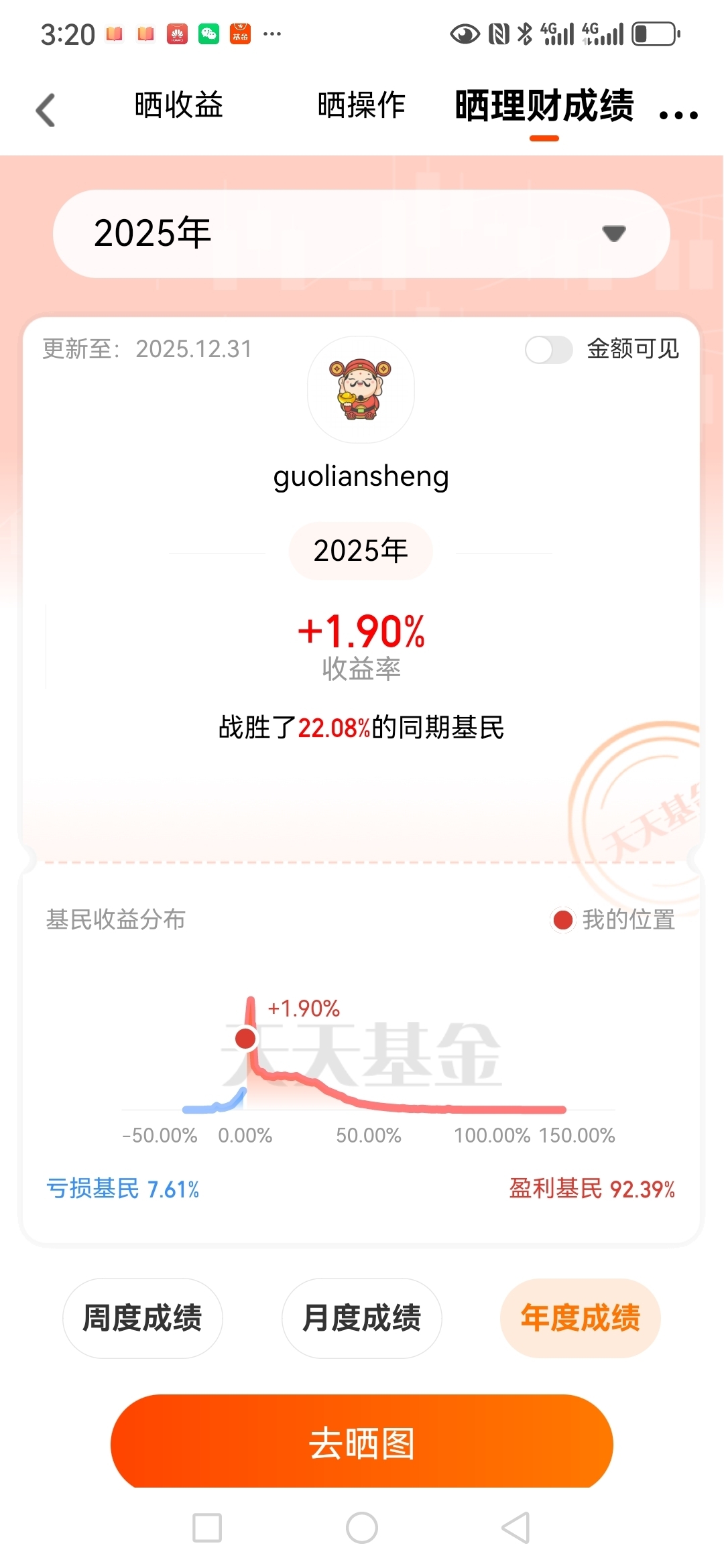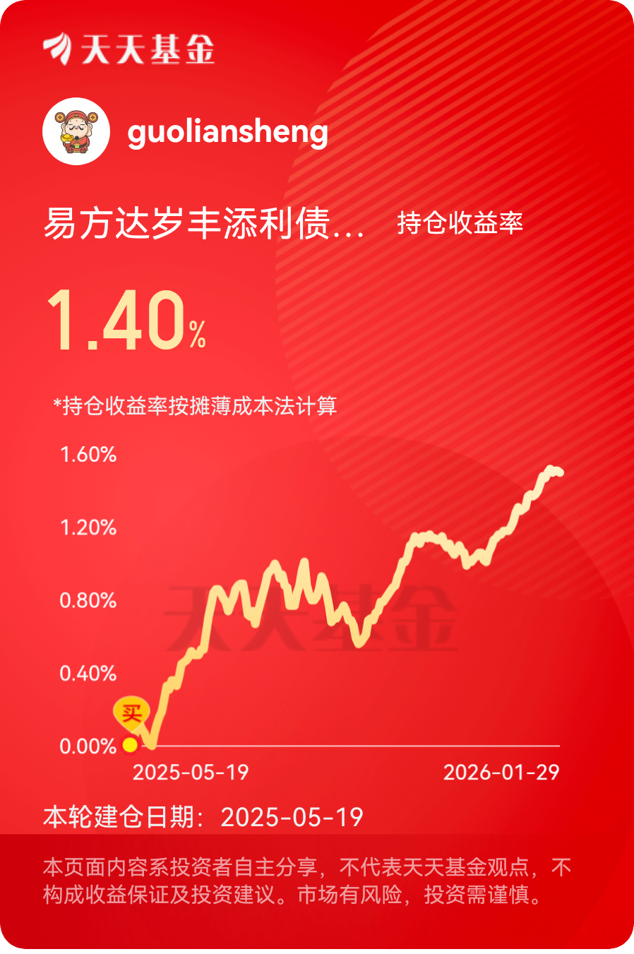 我在#2025超额关键词# 选择了“盈利但暂未超大盘” ,2025年,我的收益情况是没有跑赢沪深三百,我的超额关键词是细水长流。去年债基表现不佳,对于主投债基的我来说,能有近2个点的收益就不错了,前年债基收益10个点,平均下来一年6个点的收益已经非常满足了,期待明年能更好。#晒收益#